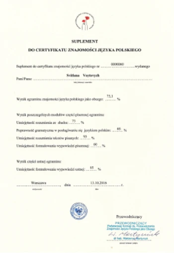 Після закінчення курсу — Державний сертифікат Республіки Польщі зі знання польської мови на рівні В1, В2, С1, С2.